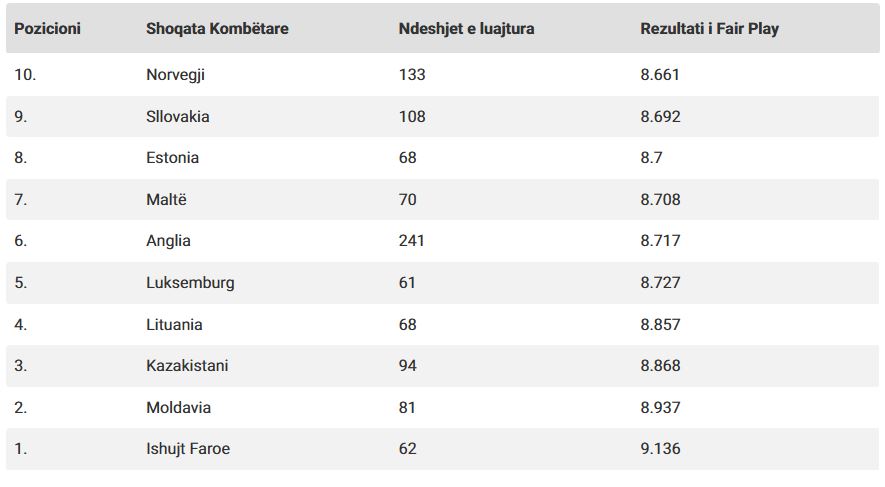 Në raportin e UEFA-s thuhet: “Shqipëria, një vend që nuk ka asnjë klub në asnjë nga tre garat kryesore të UEFA-s për klube, pjesën më të madhe të 66 ndeshjeve të tyre përfshijnë ekipin kombëtar A dhe të moshave, ndeshjet e të cilat, në përgjithësi, ka një rezultat të ulët të fair-play me një vlerësim pikësh prej 6.774 të ndjekur nga Kroacia me 7.228 dhe Serbia me 7.239 pikë, sit re vendet e fundit.”